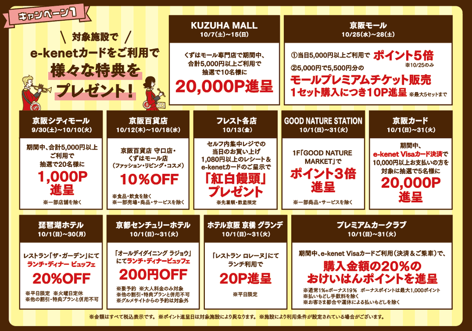 本キャンペーン期間中、おけいはんポイント加盟店でe-kenetカードをご利用のお客さまには、様々な特典をご用意するほか、e-kenetカード会員向けWEBサービス「e-kenet PLUS」からのエントリーでおけいはんポイントやホテルペアランチ券などの各種賞品が当たる豪華抽選会も実施いたします。この機会にぜひ京阪沿線でショッピングやお食事・レジャーをお楽しみください。
