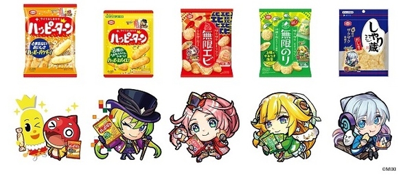 展開する商品は若年層の支持率が高く、『モンスト』ユーザーとの親和性が高い「ハッピーターン」「ハッピーターンスパイス」「無限エビ」「無限のり」「しゃり蔵」の5つ。「光・闇・火・木・水」からなる『モンスト』の5属性に合わせ、商品の特徴とキャラクターの特性を組み合わせたオリジナルコラボパッケージになっています。コラボパッケージに描かれたキャラクターはすべて「超亀田祭」仕様。全15種のバラエティ豊かなキャラクターをパッケージに採用し、ブランドをイメージしたワンポイントにもこだわりました。全キャラクターが「祭り」ならではのハッピを着用し、「超亀田祭」を楽しく盛り上げてくれます。