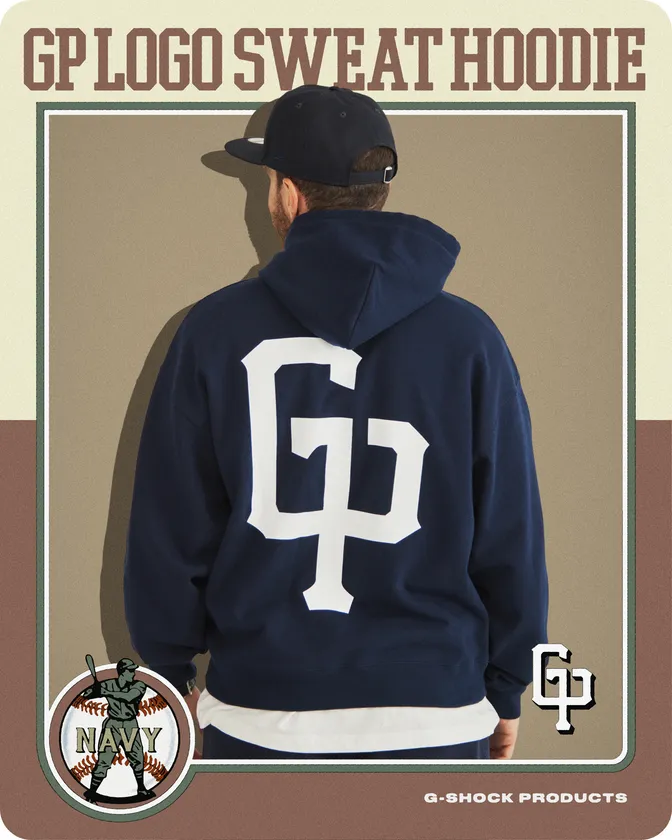 フロントとバックにオリジナルの「GP」ロゴを大胆に落とし込んだインパクトのあるロゴが印象的なスウェットフーディは、適度にルーズなフィッティングで、短めの着丈と広めの身幅がアメリカンスポーツをMIXしたコーデに最適です。こちらもスナップカーディガンと共生地の日本製ボディを採用し、どっしりとした重量感はありつつも柔らかく着やすいアイテムとなっており、左袖にはG-SHOCK PRODUCTSお馴染みのシリコンワッペンをあしらっています。スポーツスタイルは勿論アメカジスタイルなど、幅広くお楽しみいただけるスペシャルなアイテムです。