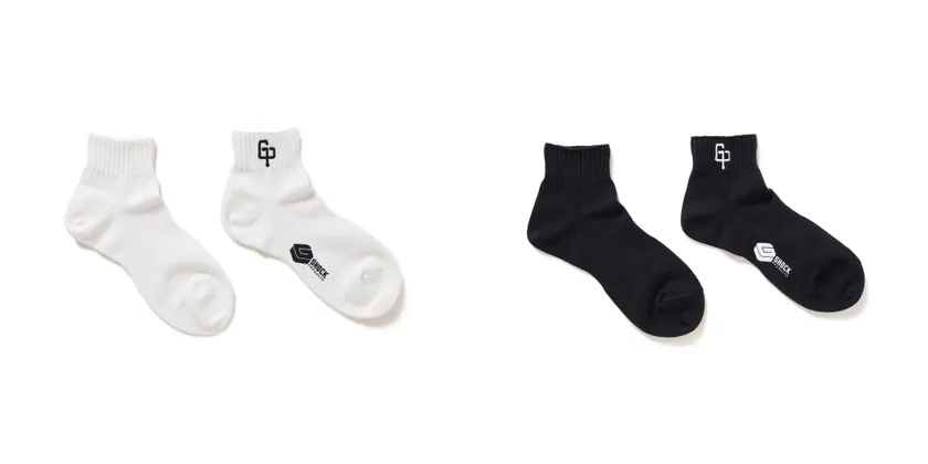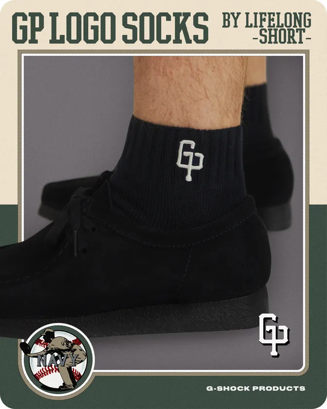 <LIFELONG by GRENCLYDE>に別注したソックスにはワンポイントの「GP」ロゴを刺繍で、ブランドロゴを足裏にプリントでそれぞれ配しました。LIFELONGのコーデュラ混紡生地は一般的な綿の生地よりも6〜10倍の強度を誇り、つま先とかかとの生地が二重になることで更なる耐久性を実現、G-SHOCKのタフネスを体現したスペシャルなアイテムとなっております。こちらはスポーティな印象のショート丈で幅広いコーディネートを支えてくれるソックスです。