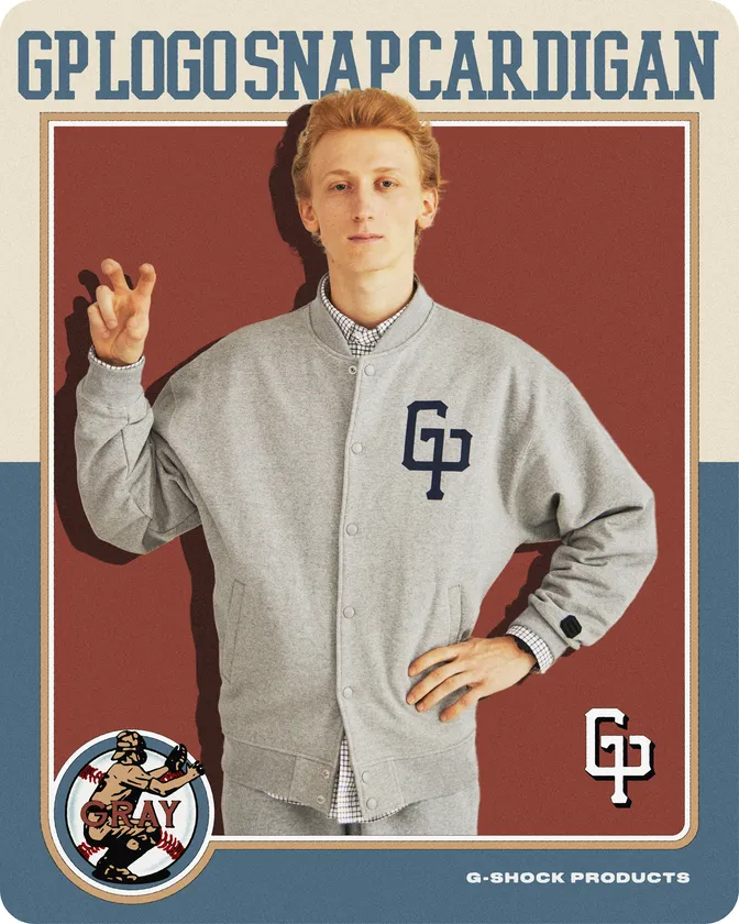 本コレクションでは、スポーツチーム「G-SHOCK PRODUCTS」をイメージして頭文字「GP」を組み合わせたオリジナルロゴを制作。適度にルーズなフィッティングとスタジャンライクなデザインが特徴的なスウェットスナップカーディガンのフロントに落とし込み、アメリカンスポーツをMIXしたファッションをイメージさせます。日本製のボディを採用しどっしりとした重量感はありつつも柔らかく着やすいアイテムとなっており、左袖にはG-SHOCK PRODUCTSお馴染みのシリコンワッペンをあしらっています。スポーツスタイルは勿論アメカジスタイルなど、幅広くお楽しみいただけるスペシャルなアイテムです。