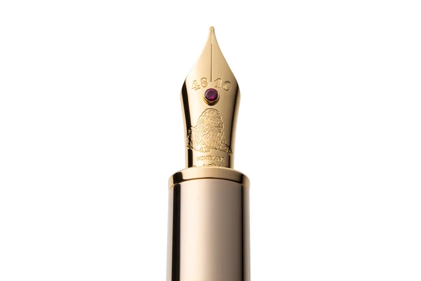 100年以上の歴史からなる万年筆の伝統的なクラフツマンシップによる美しいジオメトリーカッティングを施した、シグニチャーゴールド色の、マイスターシュテュックモデルの万年筆です。そのペン先には、三越を象徴するライオンがエングレービングされ、さらにルビーがあしらわれることで華やかさを演出します。