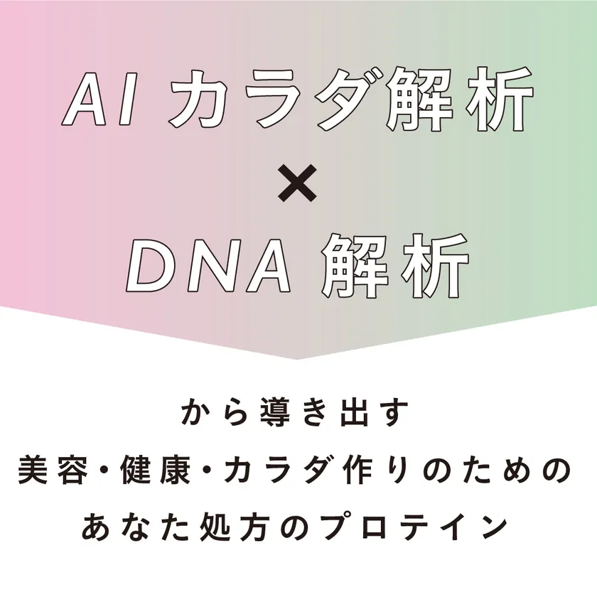多様化するニーズに応える自分専用のプロテインを製造するため、DNA遺伝子検査(化学による客観的な事実)とAIカラダ解析による体質チェック(日常生活における主観的な事実)を組み合わせることで、自分自身のカラダの状態を知ることが可能です。