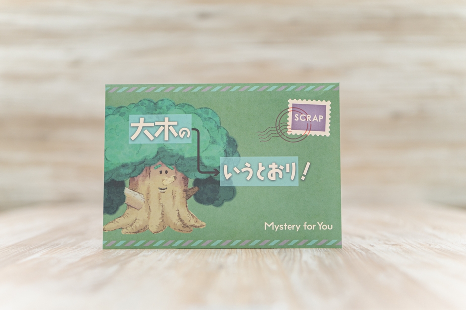 この作品では大木シートに描かれたフローチャートに従って謎を解き進めていきます。フローチャートは謎を解くことでたびたび変化します。カードやシールなどわくわくするアイテムあり、工作の要素ありで飽きずにどんどん解き進めていくことができる、個性的な謎解きをお楽しみください。