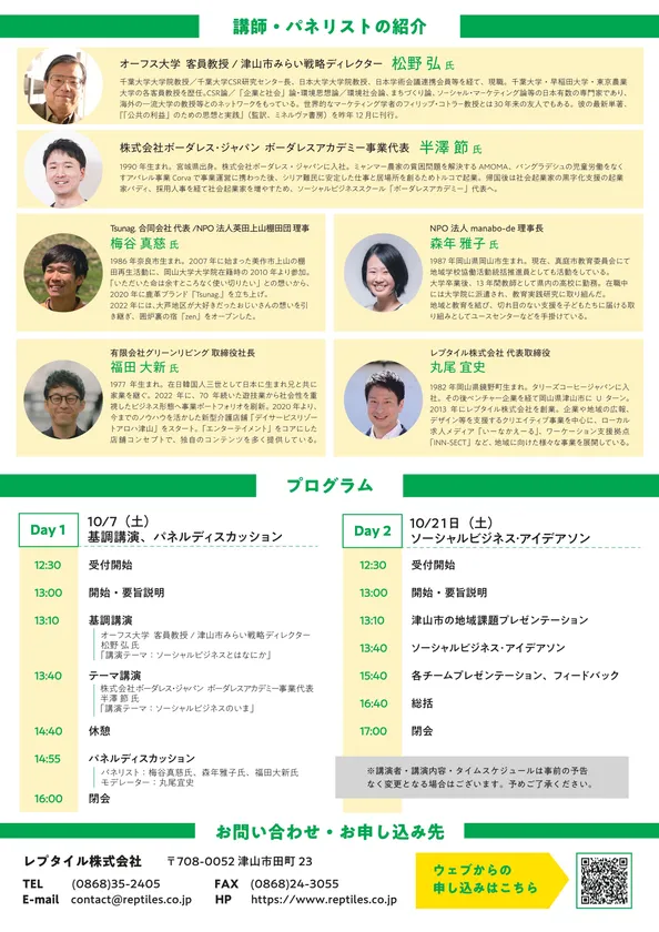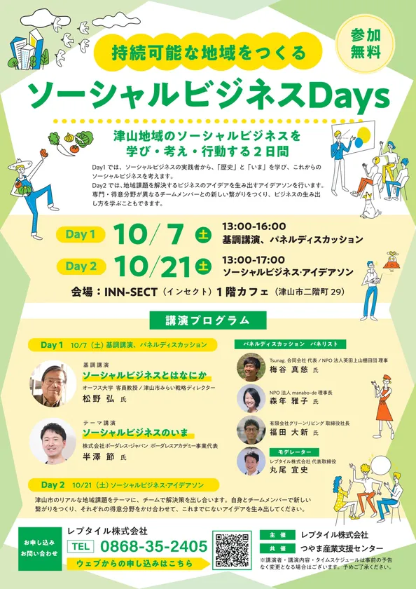 『ソーシャルビジネスDays』はレプタイル株式会社主催、つやま産業支援センター共催で行う、「岡山県北をソーシャルビジネスが起こりやすい地域に」をテーマとした2日間のイベントです。
