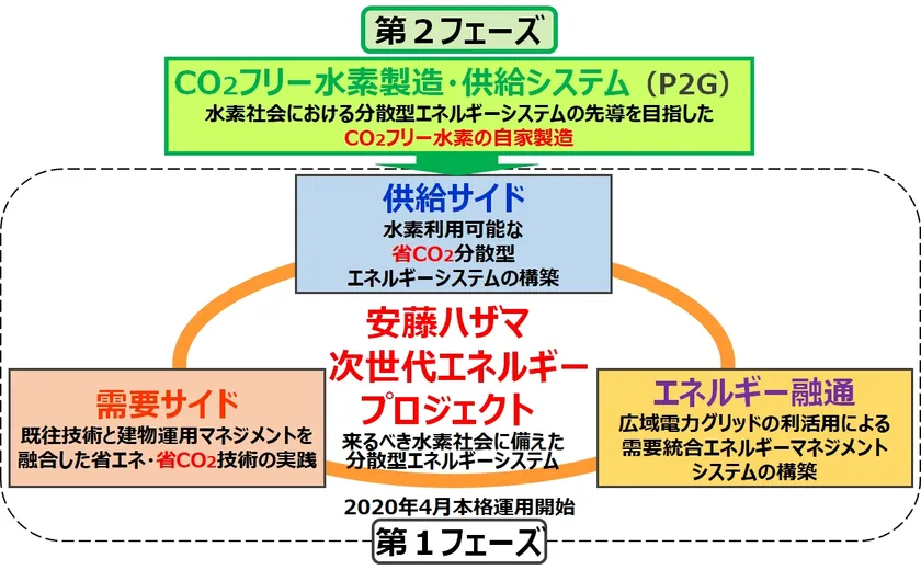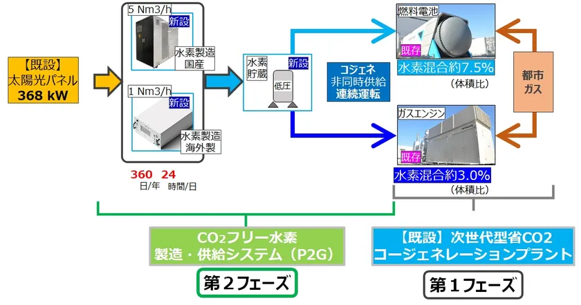 第1フェーズでは、水素社会到来を見据えて次世代型省CO2コージェネレーションプラントを設置するなど、新たな統合エネルギーマネジメントシステムを構築し、実証を進めてきましたが、第2フェーズではCO2フリー水素の製造と活用という確実な一歩を社会に示すことで、来るべき水素社会における分散型エネルギーシステムの在り方を先導することを目指します。