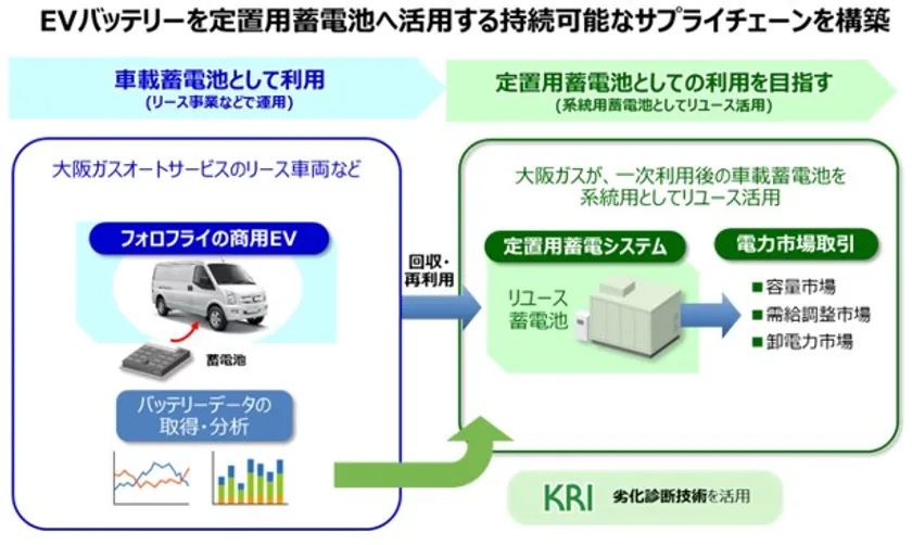 大阪ガス株式会社では2023年1月にフォロフライと資本業務提携を開始、100%子会社である大阪ガスオートサービス株式会社がフォロフライの商用EVをリース販売することで脱炭素社会の実現に貢献、リース車両として使用した同EVの車載蓄電池を定置用蓄電池※1としてリユース活用する持続可能なサプライチェーン構築を目指す計画を発表していました。今回の導入により、車載蓄電池データを取得・分析し、大阪ガス100%子会社である株式会社KRIの劣化診断※2等の技術を組み合わせることで、車載蓄電池を系統用蓄電池※3としてリユース活用するための検討がDaigasグループ内でスタートします。また、大阪ガスオートサービス株式会社は車両特性や整備に関するノウハウを蓄積し、リースや車両メンテナンスサービスの品質向上に取り組みます。
