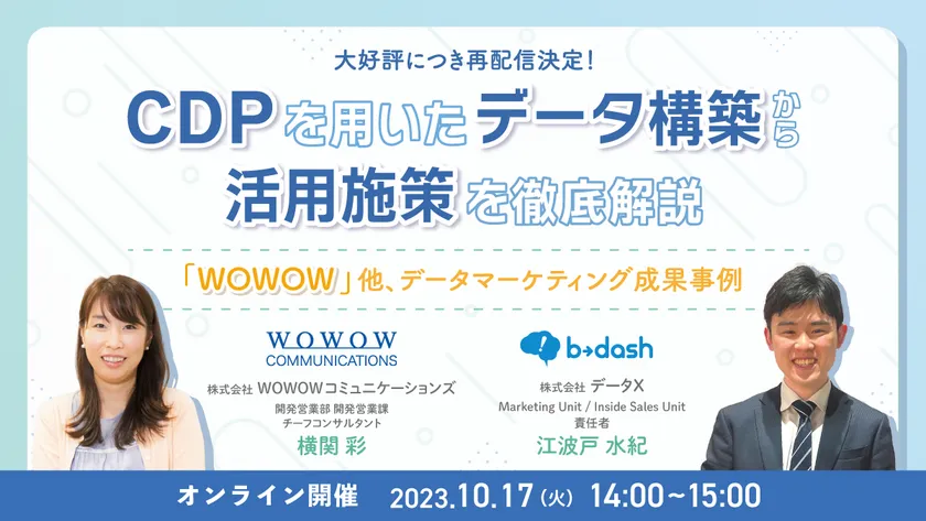 株式会社WOWOWコミュニケーションズ(本社:神奈川県横浜市、代表取締役 社長執行役員:山崎 一郎)は、2023年10月17日(火)に株式会社データX様(本社:東京都新宿区、代表取締役社長:安部 泰洋)と共催セミナー『CDPを用いたデータ構築から活用施策を徹底解説 ~「WOWOW」他、データマーケティング成果事例~』を再配信いたします。
