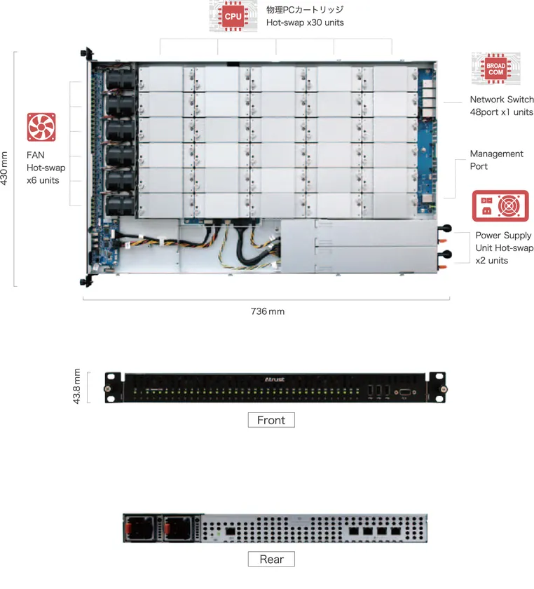 リモートPCアレイは、1つの筐体に複数の物理PC及びネットワーク装置を搭載したシンプルな構成で、非常に短期間でセキュアなリモートデスクトップ環境やインターネット分離環境の構築が可能です。