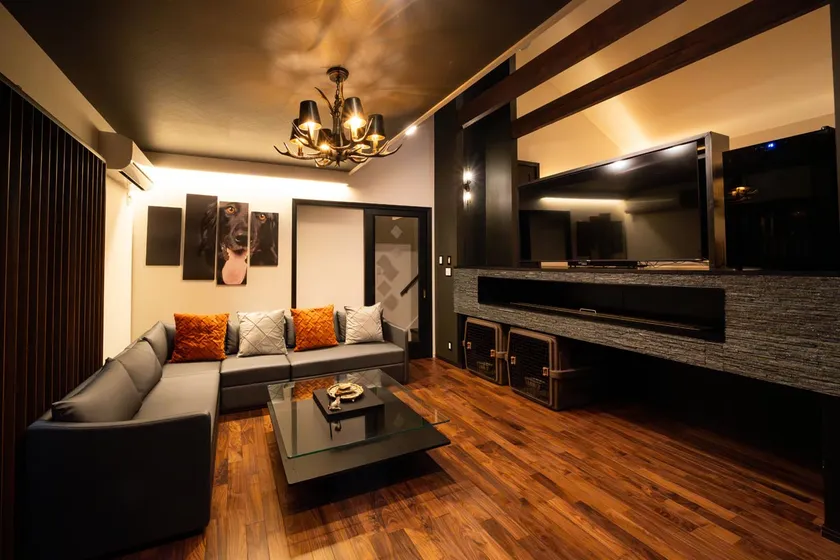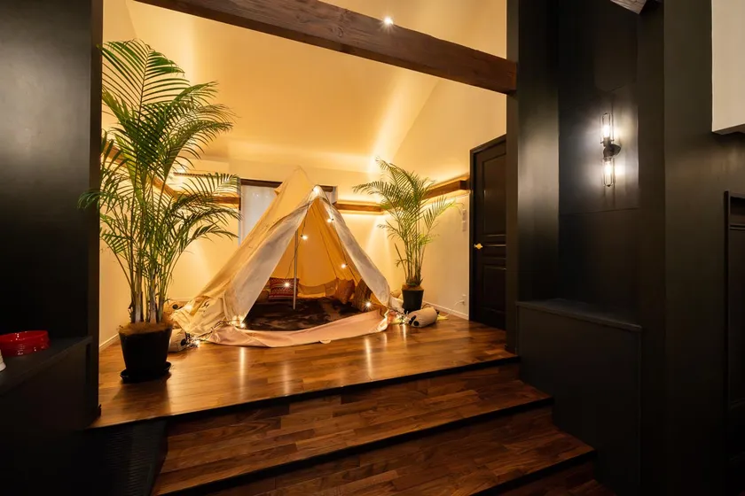 特別な滞在を追求した室内には家具や照明にまでこだわった広々としたリビングと、屋内に居ながらゴロゴロゆったりくつろげる屋内テントを設置しております。愛犬との非日常空間をお愉しみいただけます。