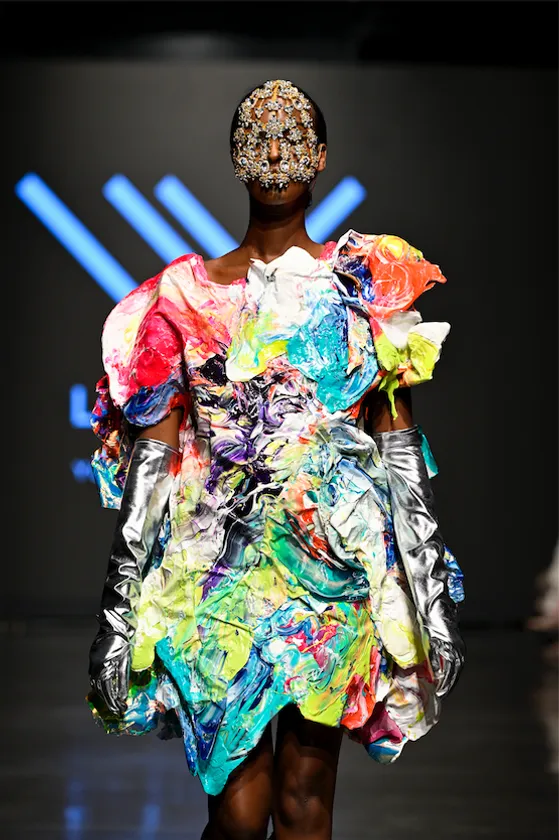 「絵の具」をそのまま身に纏うようにしたそのドレスは、