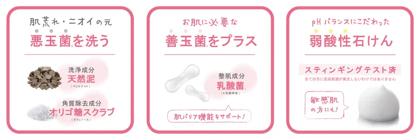 そこでペリカン石鹸は、多すぎる悪玉菌*を洗い流し、デリケートゾーンの肌バリア機能をサポートする善玉菌(乳酸菌)**をプラス。通常、乳酸菌**配合の商品はデリケートゾーンを洗った後に塗布するタイプや飲むタイプが一般的だが、本商品は、日常的に行う“体を洗う”という行為だけでデリケートゾーンの肌トラブルの元となる肌荒れを防ぐ石鹸です。