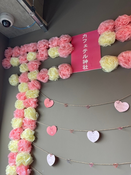 カフェテル神社は、CAFETELの2階エレベーターフロアに設置しました。宿泊者だけが入ることができる、女性専用エリアです。2色のやさしいトーンのペーパーフラワーでカラフルな神社をイメージし、オリジナルの鳥居をつくりあげました。どんなおなやみも優しく受け止める、カフェテル神社の登場です。