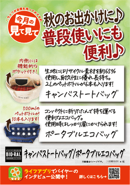 “おいしい” “ワクワク” “ハッピー” をお届けするライフコーポレーションは、おしゃれで使い勝手が良いとご好評いただいている“BIO-RALバッグシリーズ”から、「キャンバストートバッグ」「ポータブルエコバッグ」を9月より新発売いたしました。