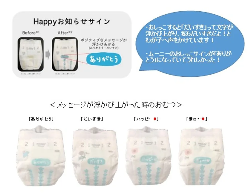日本において年間出生数の約半数は第一子※1です。このため、初めて子育てをする保護者の多くは、育児に不安を抱いています。なかでも一日に何回も交換しなければならない紙おむつは、「正しい着け方がわからない」や「交換に自信がない」という方が多くいらっしゃいます。一方で紙おむつの交換は赤ちゃんとのコミュニケーションの時間でもあります。このため、当社では、赤ちゃんのおしっこに反応して「ありがとう」や「だいすき」といったポジティブなメッセージが浮かびあがる“Happyお知らせサイン”を2019年にムーニーブランドの一部で採用するなどし、多くの保護者より好評をいただいています。
