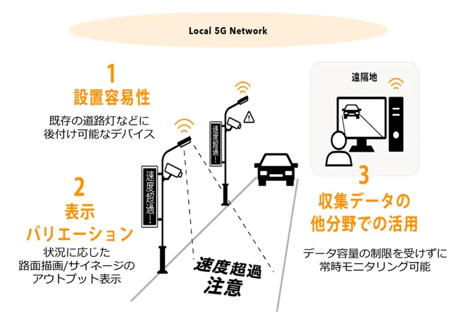 市道にある既設の複数の道路灯をスマート道路灯化し、大容量、低遅延、専有性の高い通信特性をもつローカル5Gに接続することで、道路灯に搭載された筐体組込み型AIカメラや環境センサーから取得したデータを利活用する実証を行います。