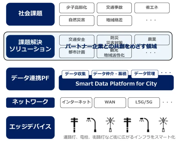 中長期的には、パートナー企業との共創による新たな価値の創出を通じて、防犯や設備管理、農業など地域における複数テーマの課題解決に寄与するため、「Smart Data Platform for City」(※4)のエッジデバイスとして活用していくことをめざします。