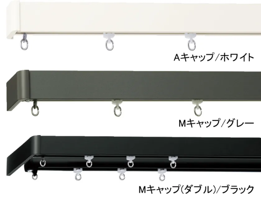 レールとキャップがシームレスに繋がったように見える、シンプルなデザインのカーテンレールです。カラーラインナップはマットな質感のホワイト/グレー/ブラックのモノトーンな3色展開で、壁や天井に馴染みカーテンを引き立てます。