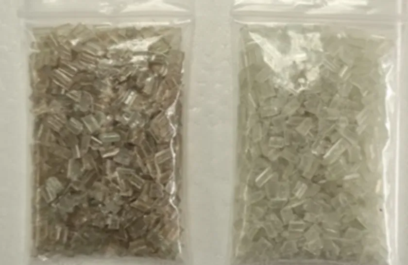 左:一般的な再生PSペレット 右:当社再生PSペレット