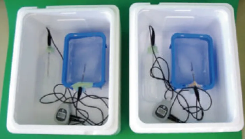 再生発泡スチロール原料と、通常の原料で製造した製品を比較する保冷性能試験を実施したところ、