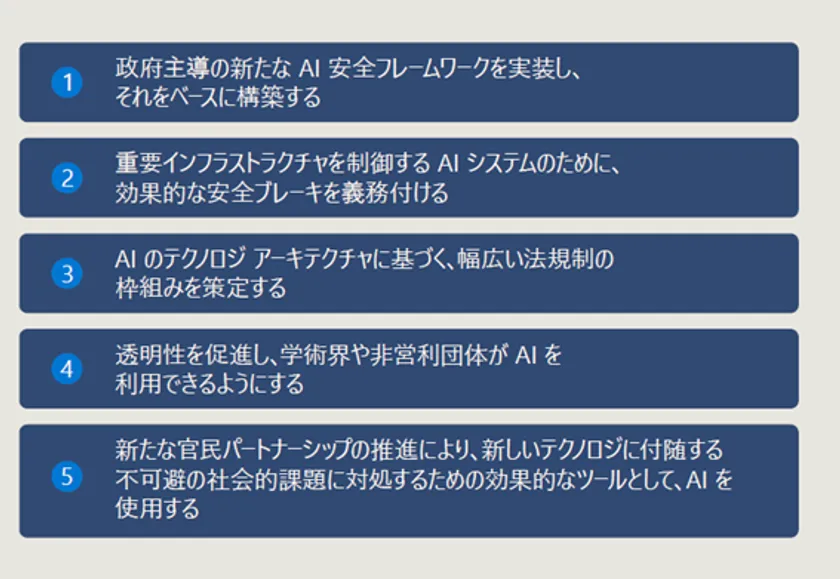 マイクロソフトは、「責任あるAI」プログラムで得られた教訓を基に、AIガバナンスの推進に役立つ5項目から成るアプローチの詳細を示す青写真を5月に公開しました。ここでは、日本の状況に即してそうした政策アイデアや提言を示します。具体的なステップは以下のとおりです。