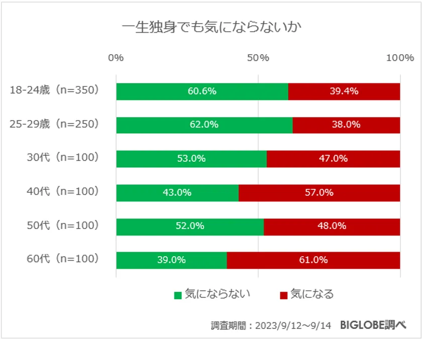 一方、「一生独身でも気にならないか」を質問すると、18歳から24歳までのZ世代の60.6%が「気にならない」と回答。年代別では、25歳から29歳が62.0%と最多になり、若年層は一生独身であることを気にしない人が多数派であることがわかった。