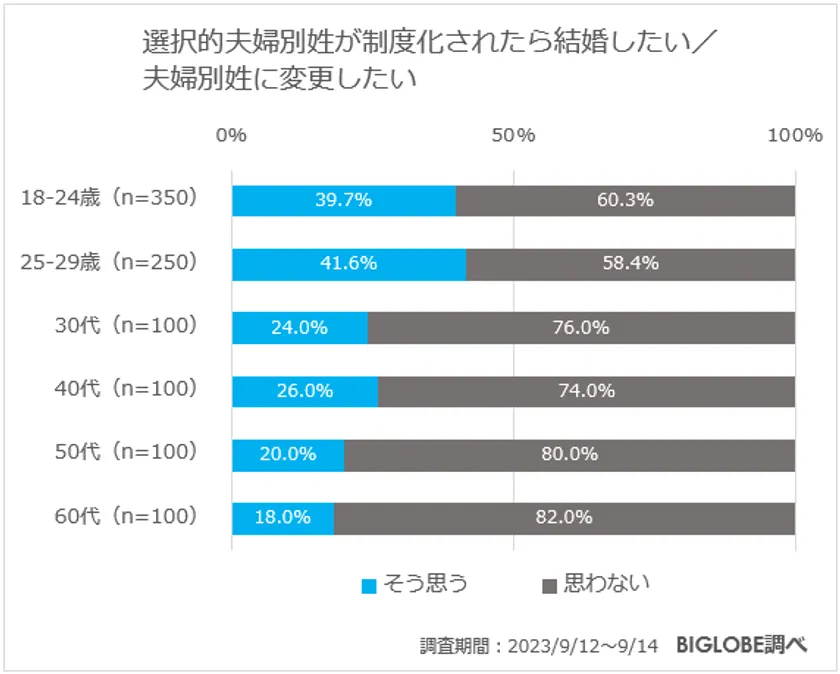 また、「選択的夫婦別姓が制度化されたら結婚したい/夫婦別姓に変更したい」と考える人は、18歳から24歳までのZ世代で39.7%となった。年代別では、25歳から29歳が最多で41.6%。30代以降は大幅に下がり、30代で24.0%、40代で26.0%、50代で20.0%、60代で18.0%となった。