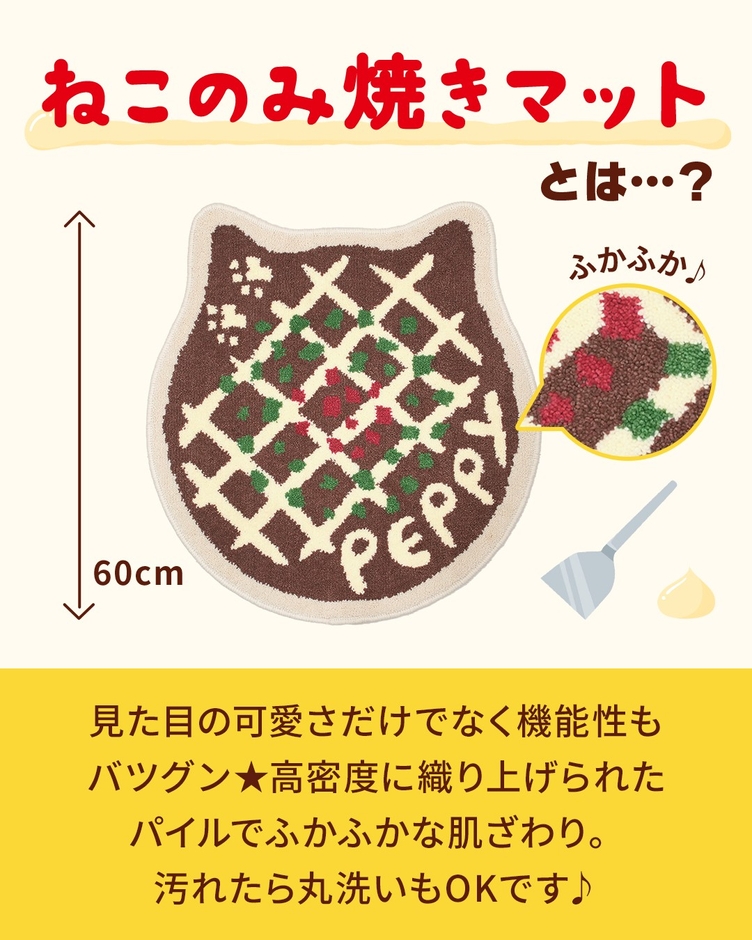 愛猫とのコミュニケーションに欠かせない「おもちゃ」。ペピイの商品開発担当が猫にマヨネーズを抱きしめてもらうべくお作りした「けりマヨ」をもっと多くの方にご購入いただくため、猫型お好み焼き柄のマット「ねこのみ焼きマット」を特別にご用意いたしました。特典の「ねこのみ焼きマット」はマット製造・販売会社のRugtasuに特注のため完全非売品。