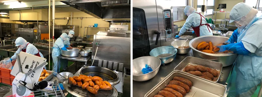 給食室で稼働するkubi(左)と揚げパンを仕分ける調理員(右)