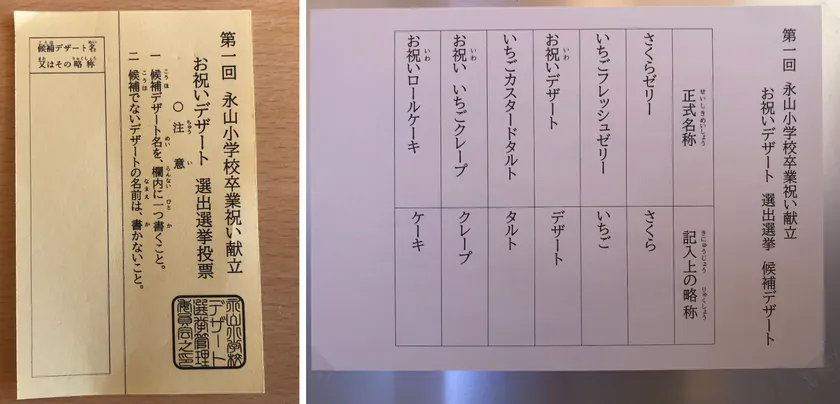 お祝いデザート選出選挙の投票用紙や候補の掲示