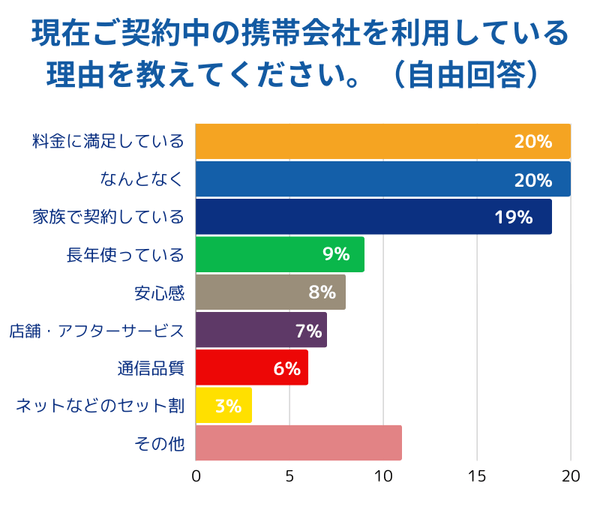 現在契約している携帯会社を利用している理由を自由回答で質問したところ、明確な理由としては「料金に満足している」「家族で契約している」が多数となりました。