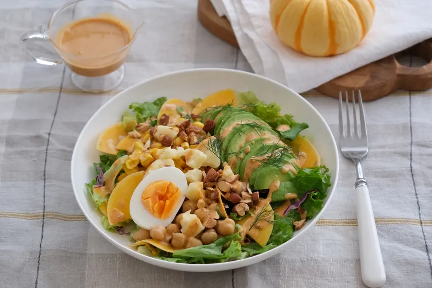 ▲バターナッツかぼちゃとアボカドと卵のサラダ(黄色)