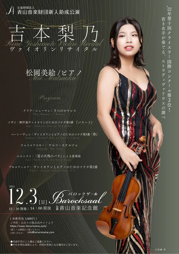吉本梨乃ヴァイオリンリサイタル詳細ページ: https://minorinome.com/rinorecital2023kyoto/