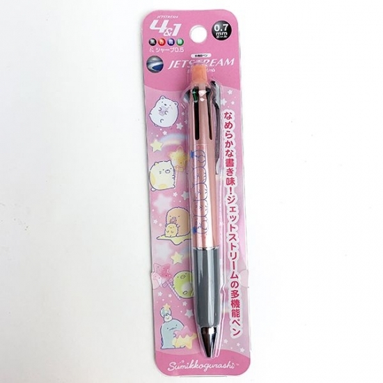 子供から大人までの沢山の人達に愛されているすみっコぐらしの文房具が登場!ペン1本で5つの機能☆黒・赤・青・緑の4色ボールペン&シャープペンシル0.5の機能があります。ボールペンはなめらかな書き味のジェットストリームインク♪大人カジュアルでシンプルなデザインですので、ご年齢問わずお使いいただけます。プレゼントとしても喜ばれると思います♪
