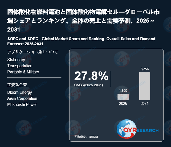 QYResearchが発表した新たな市場調査レポート「固体酸化物燃料電池と固体酸化物電解セル―グローバル市場シェアとランキング、全体の売上と需要予測、2026~2032」によると、世界の固体酸化物燃料電池と固体酸化物電解セル市場規模は2024年の約1614百万米ドルから2025年の1899百万米ドルへと順調に拡大すると見込まれ、予測期間中は年平均成長率(CAGR)27.8%で成長し、2031年には8256百万米ドルに達すると予測されている。