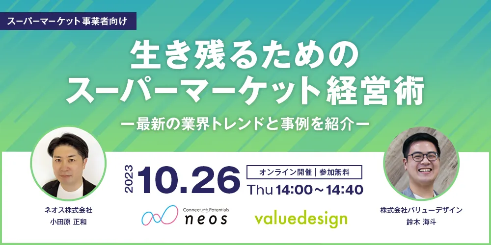 テクミラホールディングスの子会社であるネオス株式会社(本社:東京都千代田区、代表取締役 社長執行役員:池田 昌史、以下 ネオス)は、株式会社バリューデザイン(本社:東京都中央区、代表取締役社長:林 秀治、以下 バリューデザイン)と共同で、 “生き残るためのスーパーマーケット経営術”をテーマにキャッシュレスサービスやアプリのベストプラクティスをご紹介するオンラインセミナーを10月26日(木)に開催いたします。