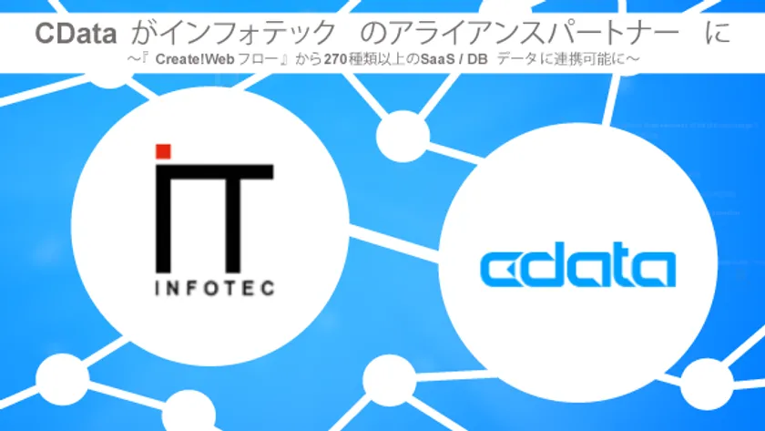 2023年10月17日、インフォテック株式会社(本社:東京都新宿区、代表取締役社長:山田 智次)は、CData Software Japan 合同会社(本社:アメリカノースカロライナ州、日本オフィス:宮城県仙台市、代表社員 職務執行者:疋田 圭介)とアライアンスパートナーとして協業を開始しました。本パートナーシップでは、インフォテックのワークフローシステム『Create!Webフロー』でCDataのJDBC Driversを使うことで、企業はCreate!WebフローからSalesforce、kintone をはじめとする270種類以上のSaaS / DBにシームレスにアクセスできるようになります。ノーコードでクラウドデータにアクセスが可能になることで、ワークフロー利用シーンが格段に広がり、ユーザーのデータ活用を下支えします。