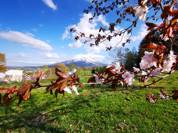 5月の北海道ニセコエリアは、桜が開花する季節です。例年、ソメイヨシノなどの桜はゴールデンウィーク頃に咲き始めます。ピンク色の桜が咲き(春)、野には青々とした新緑(夏)、羊蹄山などの山の上には雪が残っています(冬)。さらに、イタヤカエデなどの木々は春にも一度紅葉します(秋)。これらの各季節の色が一度に集まる季節です。