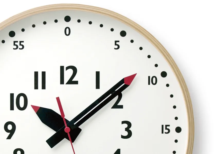 ふんぷんくろっくは、小さな子供でも読みやすい工夫がされています。1から12までのアラビア数字に加え、さらに外側に0から55の数字が5分刻みで描かれた文字盤と鉛筆型の針が特徴です。太さを変えた時針・分針・秒針があり、太い順に針先の指している数字を読むことで、だれでも時計を読むことができます。親や祖父母の世代にも読みやすいと評判です。