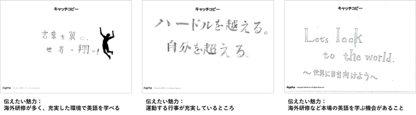 英語教育を魅力に設定した生徒は、英語のコピーをメインにしたり、バレーボール好きのターゲットに合わせて“横断幕”に使われる言葉を用いたキャッチコピーに仕上げたりと工夫を重ねました。また、運動行事の豊富さを魅力とした生徒のキャッチコピーは、ストイックに努力をすることで見える自分の成長を想像させるものとなりました。