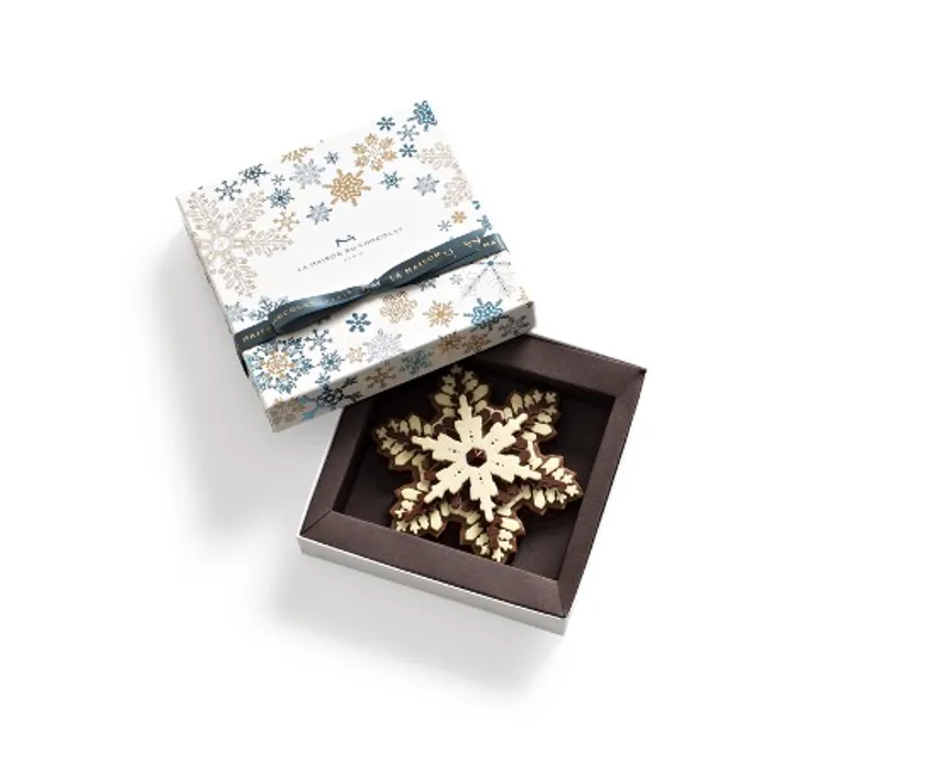 雪の結晶が描かれたコレクション限定デザインのパッケージに収め た、星やツリーなどのクリスマスモチーフを象ったダークとミルクのチョコレート。