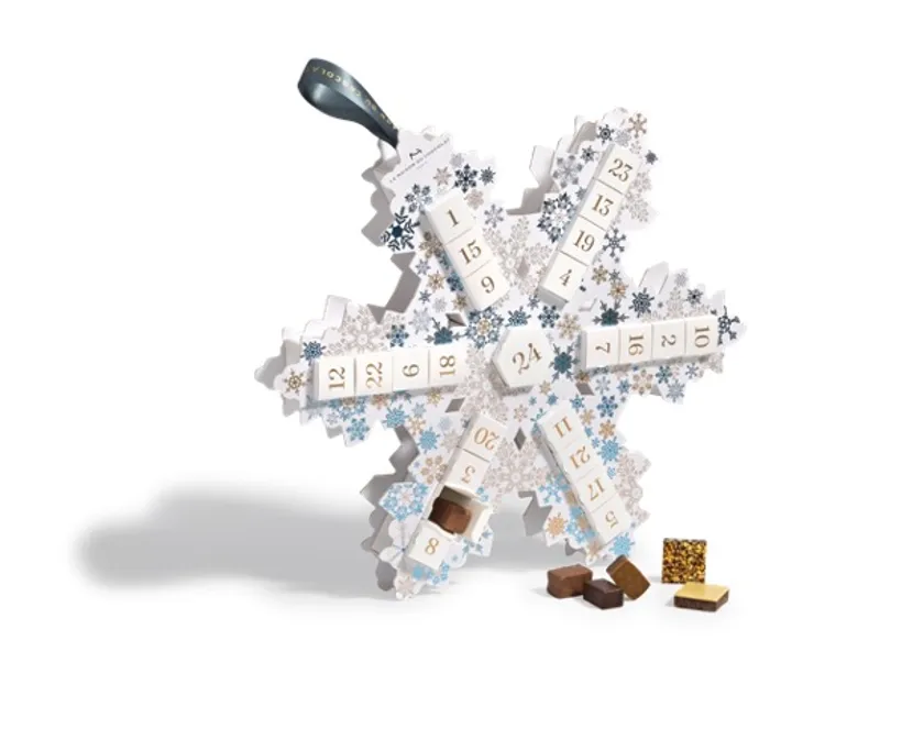 コレクションテーマに合わせた雪の結晶型のアドベントカレンダーには、26個のチョコレートが収められており、毎日ひとつずつ開けて美味しい喜びを味わい、イブまでの日々を心高鳴るカウントダウンの渦に巻き込みます。氷のような冷感の感じられる白x青のデザインもまたホリデーシーズンの気分を高める華やかな演出にぴったり。