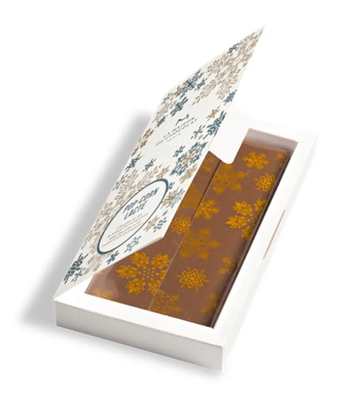 細かく砕いたポップコーン入りのミルクチョコレートに、なめらかなミルクチョコレートの層を重ね雪の結晶のデザインをプリントしたタブレット。