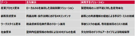 産業プロセス変革、顧客接点変革、ワークスタイル変革、社会変革の4つのゾーンで先進のソリューション・テクノロジーを展示します。展示されている最先端のソリューション、テクノロジーは労働力不足や顧客接点強化など、お客さまが直面している課題解決に向けたヒントとして活用できます。
