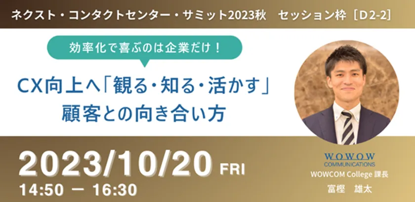 株式会社WOWOWコミュニケーションズ(本社:神奈川県横浜市、代表取締役 社長執行役員:山崎 一郎)は、株式会社リックテレコム主催「ネクスト・コンタクトセンター・サミット2023秋」におきまして、10月19日(木)「『働きやすい職場』づくり」のセッション枠[D1-2]及び、10月20日(金)に「顧客理解×CX設計」のセッション枠[D2-2]に登壇いたします。