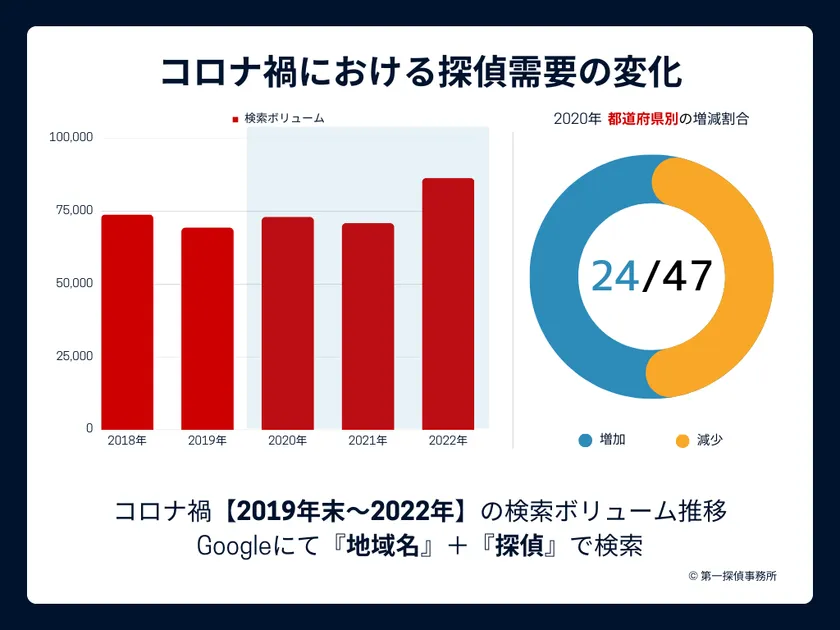 第一探偵事務所(所在地:宮城県仙台市、代表者:佐藤 翔吾)は、探偵業の市場規模とコロナ禍における探偵需要の変化(2018年~2022年)をGoogle検索ボリュームの推移から測定しました。