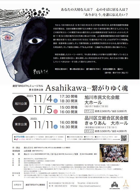 劇団「BREATH」/放送作家集団DNP主催、ミュージカル 第8回本公演『asahikawa...繋がりゆく魂』が2023年11月11日 (土)に品川区立総合区民会館 きゅりあん 大ホール(東京都東京都品川区東大井5-18-1)にて上演されます。