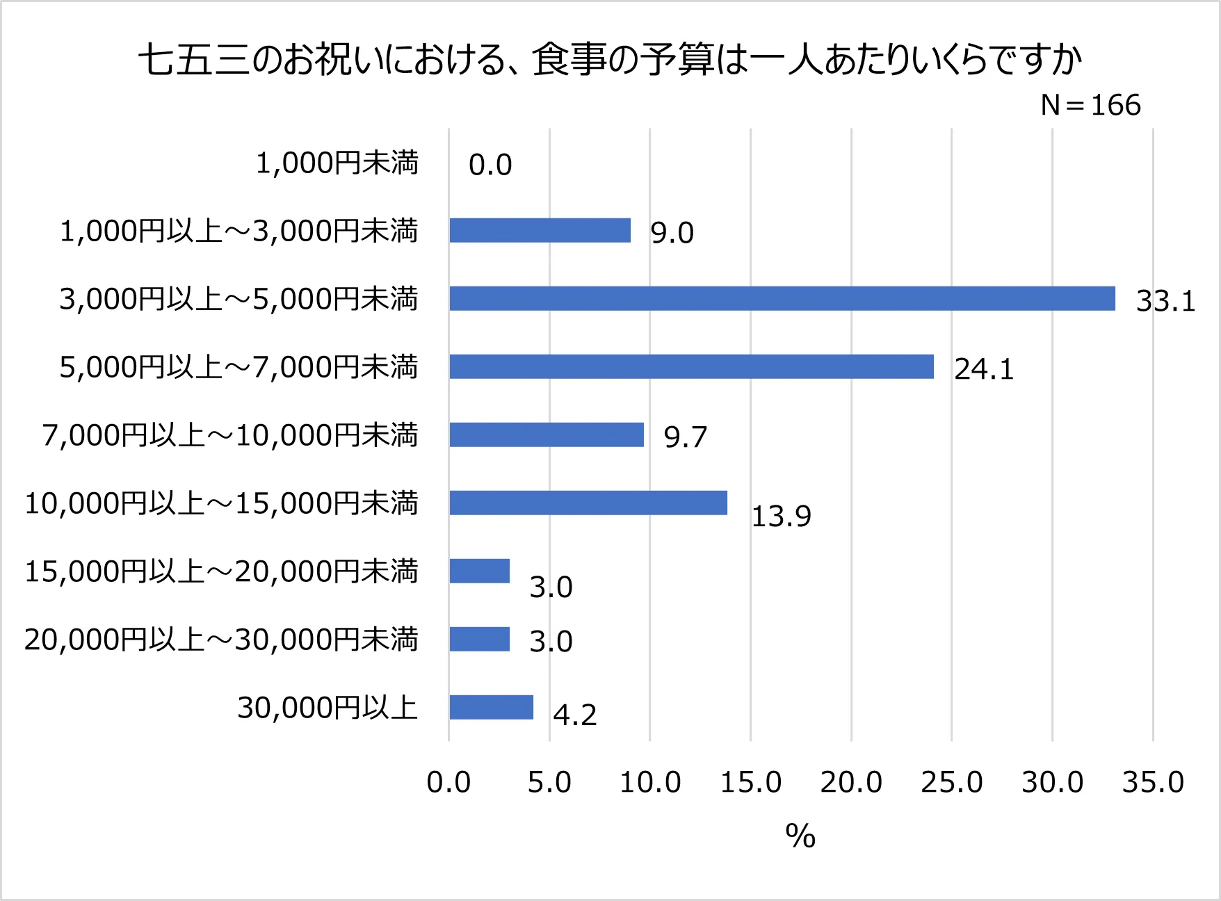 今年はコロナ禍に比べて増加傾向にあった、お店での食事会。七五三の祝い方の調査で「お店での食事会」を選んだ人に、その一人当たりの予算額を尋ねると、最も回答が多かったのは「3,000円以上~5,000円未満(33.1%)」でした。次に「5,000円以上~7,000円未満(24.1%)」が続き、約6割が3,000円以上~7,000円未満で検討していることが分かりました。