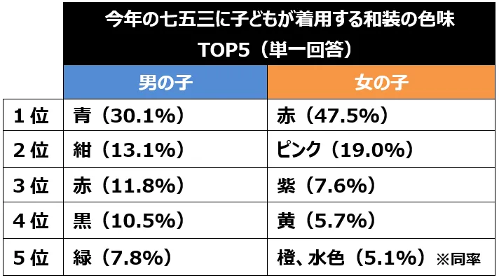 今年着用する和装の色味ランキング1位 男の子「青」、女の子「赤」
