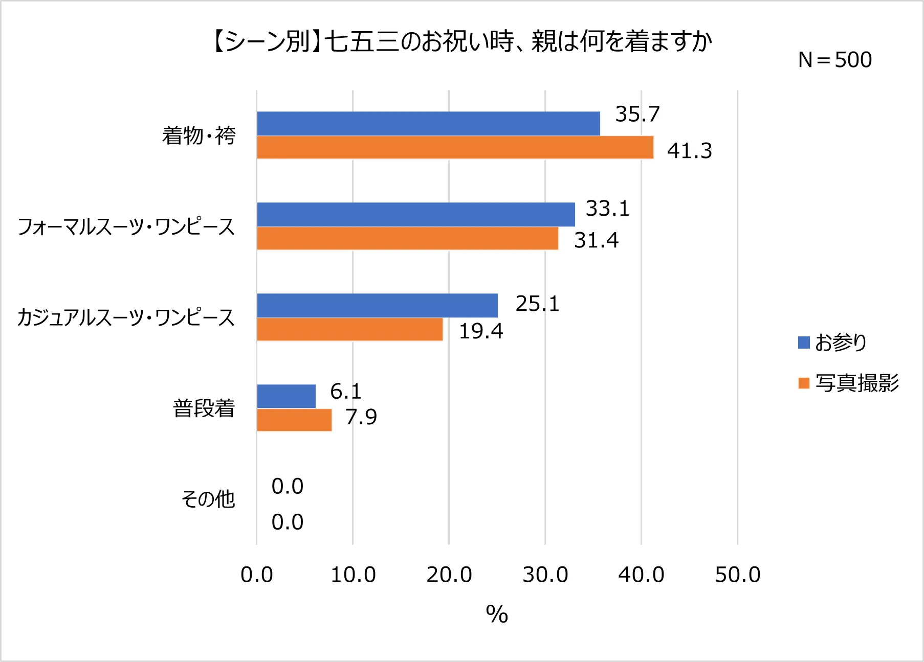 子どもの衣装として人気の和装ですが、親はどのような衣装を着るのでしょうか。シーン別に調べてみると、写真撮影時とお参り時どちらも半数以上が「スーツ・ワンピース」と回答した一方で、「着物・袴」という回答もお参り時は35.7%、写真撮影時は41.3%と、多いことが分かりました。